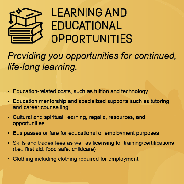Learning doesn’t stop after high school, and you deserve to learn and keep learning into adulthood. We understand you are going to grow in meaningful ways. We want you to succeed in schooling and training opportunities by moving at your own pace and with the resources to help you get there. This also includes the pursuit of cultural and spiritual learning.