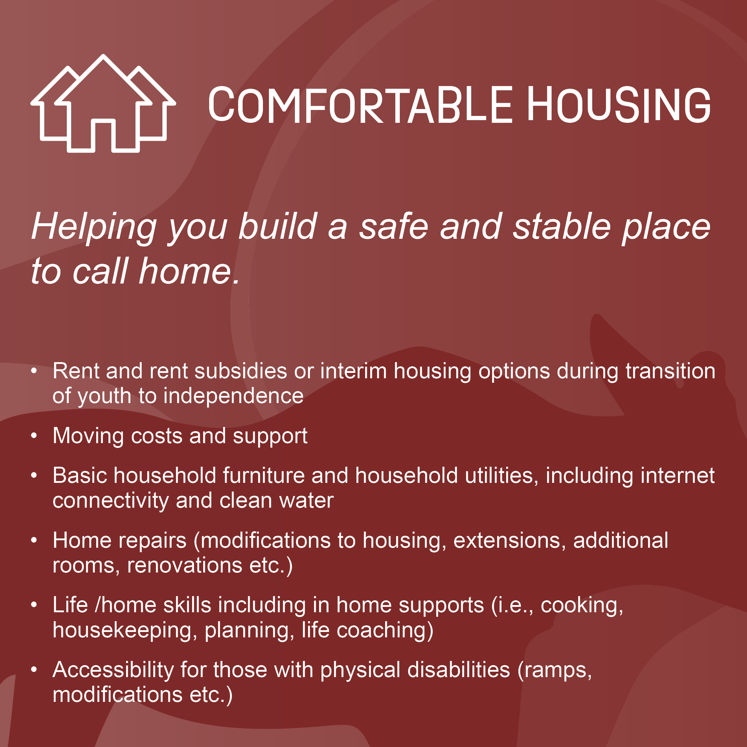 The right to a normal life begins with a place to call home and the stability that comes with it. We want to help you find accessible, safe, and affordable housing reflecting your community’s realities. This doesn’t mean you can’t still live with your family or Foster Parents. Rather, this gives you the opportunity to begin moving toward greater independence, which could include getting your own place or furniture to get you started.